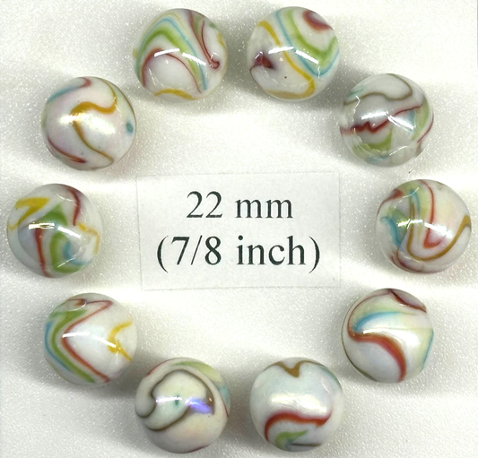 (Lot of 10) PANAMERICAN White/Red/Green/Blue/Yellow Iridescent Glass Marbles 22mm (7/8 inch) SHOOTER Taw Lot