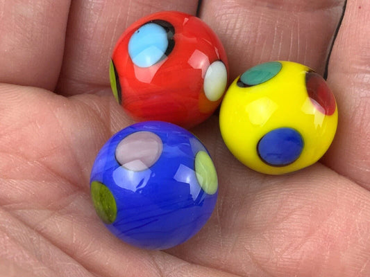 3 DOODLES 16mm Handmade Art Glass Blue Red Yellow Spots/Dots Marbles