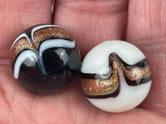2 INSIGNIA 16mm Handmade Art Glass Black Banded Gold/Copper Lutz White Marbles