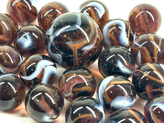 25 Glass Marbles ROCKET Brown/White Transparent Taw Mib Shooter