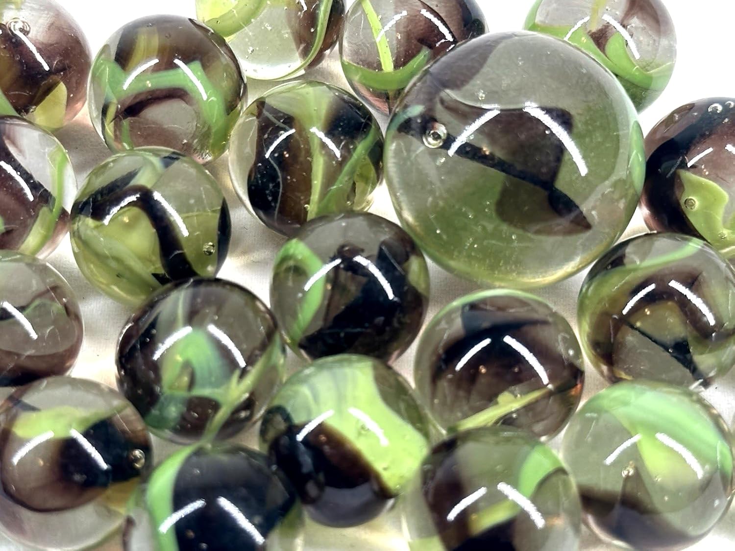 25 Glass Marbles BIGFOOT Clear/Green/Brown Shooter game Pack Swirl