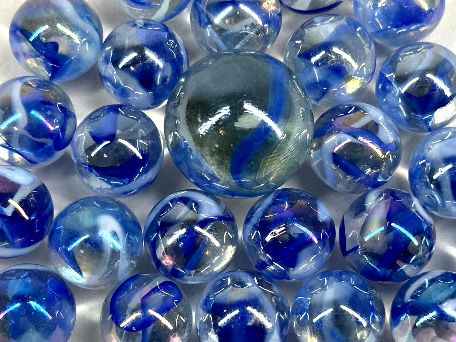 Lot includes a 1" shooter and 24 - 5/8" marbles. These beautiful Great White Shark marbles are clear glass with swirls of white and blue. They are new and in mint condition. Photos are stock photos, the marbles you receive will be similar to the ones shown, but every marble is different from the next and they will vary slightly from the photos. Check out our other listings for other styles, we do combine shipping.